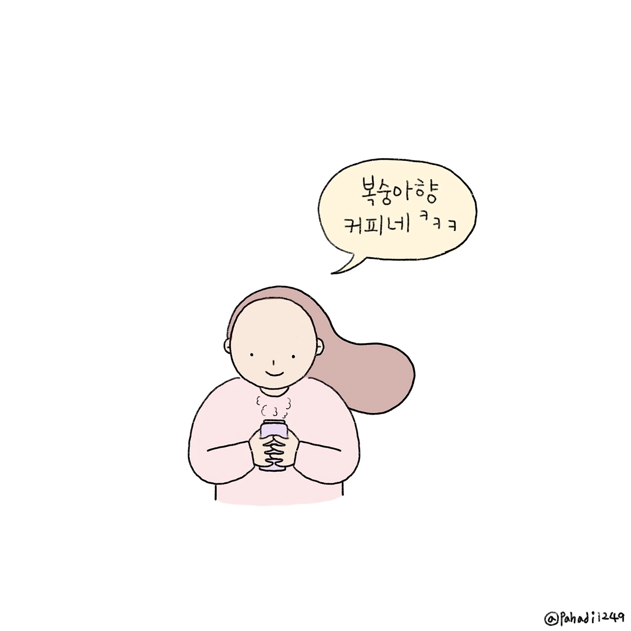 그렇게 며칠을 내리 복숭아 차를 마셨다. 오늘은 커피를 마셔볼까. 텀블러 가득히 커피를 담았다. 커피 향이 물씬 풍겨오는데 오늘따라 커피가 더 맛있다. 오랜만이라 그런가. 한 모금 두 모금 마시는데 아! 커피에서 은은한 복숭아 향이 베어 나온다.