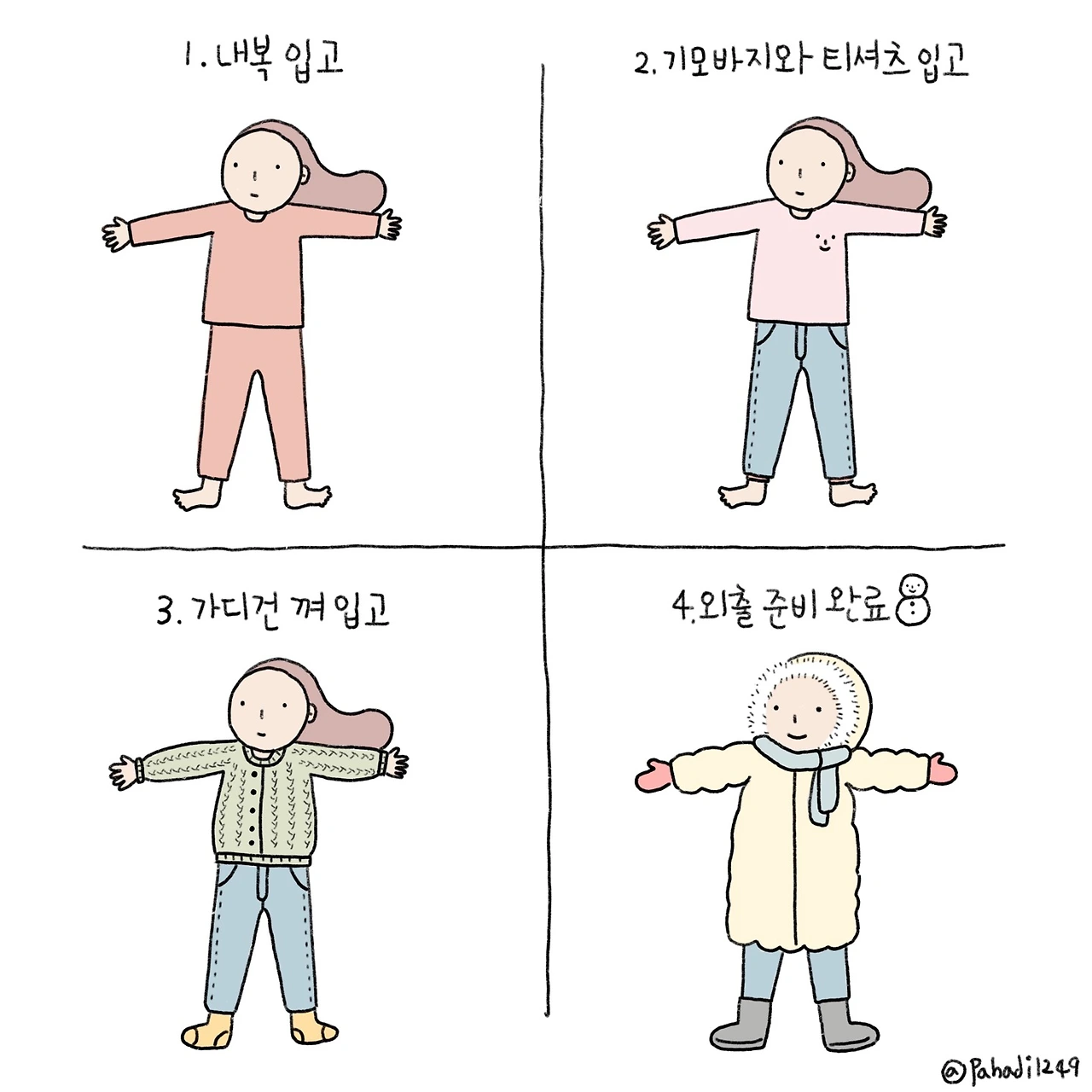 내복을 입는다. 그 위에 기모 바지를 입고 얇은 티셔츠를 덧입는다. 그리고 카디건을 껴입는다. 확실히 여며지도록 단추가 있는 카디건이 좋다. 두툼한 울 양말을 신는다. 가지고 있는 외투 중 가장 두껍고 따뜻한 걸 꺼낸다. 외투 모자를 둘러쓰고 마스크를 끼고 장갑으로 마무리하니 집을 나설 용기가 생긴다.