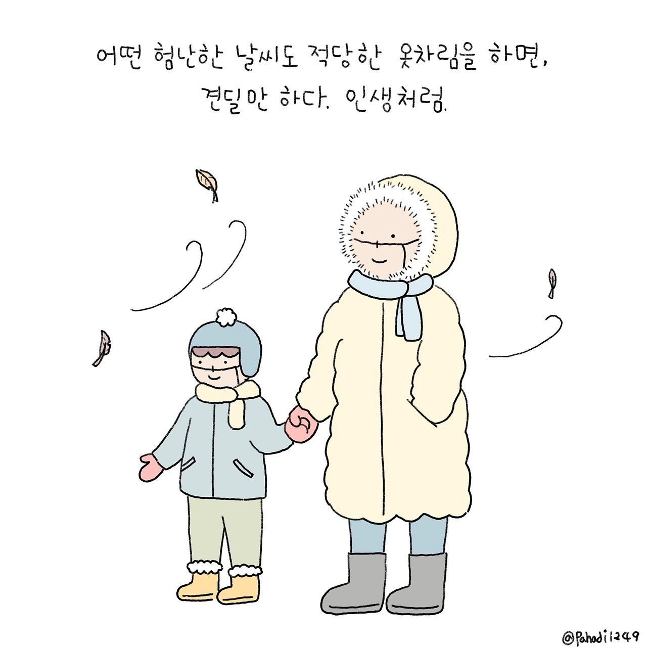 현관문을 열자 차가운 바람이 얼굴을 때린다. 단단히 준비한 덕분에 오들오들 떨리는 추위는 면했다. 차가운 바람이 오히려 상쾌하게 느껴진다. 기분이 좋아져 씩씩하게 걸으려는데 켜켜이 겹쳐진 옷 때문에 움직임이 살지 않는다. 마음은 개선장군인데 몸은 미련한 곰 같아 큭큭큭 웃음이 난다.