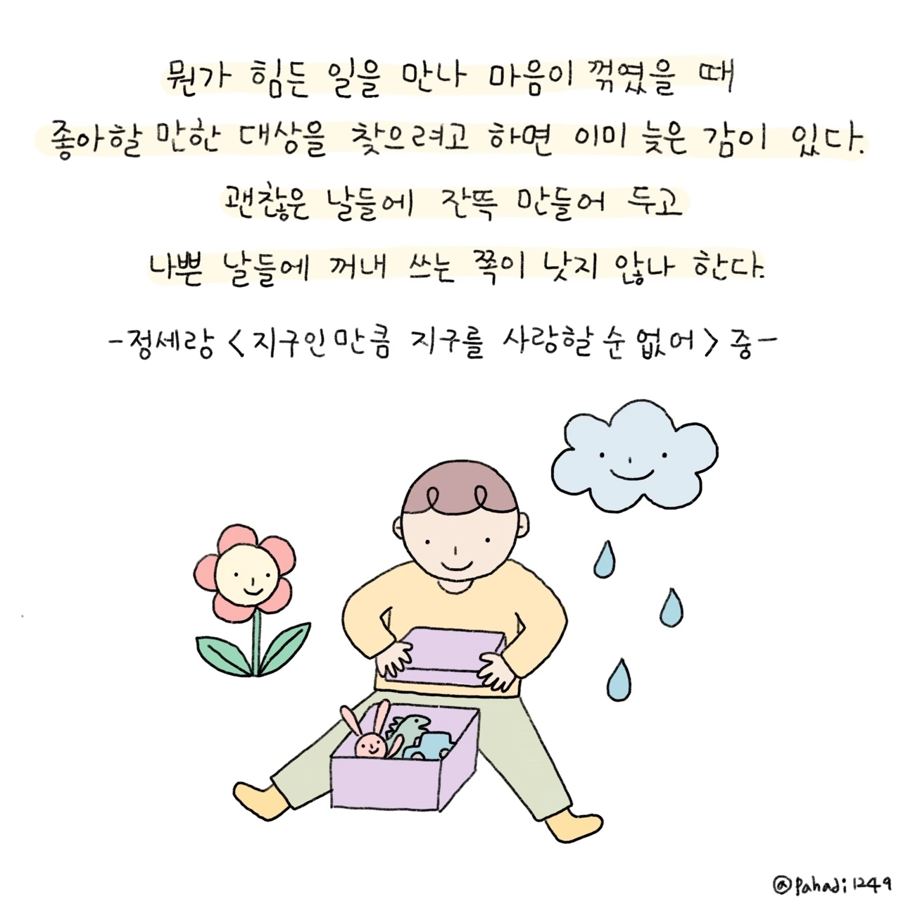 잘 생각해보면 쇼핑이나 커피말고도 내가 좋아하는 것들이 많다. 책 읽기도 그 중 하나다. 숨쉬는 것조차 버거울 땐 서점으로 달려가 책을 고르는 일도 벅차다.(이 기분좋은 일조차!) 그럴 때를 대비해 미리미리 좋아하는 책들을 내 방 책장에 준비해둬야 한다. 김영하 작가도 읽을 책을 사는 게 아니라 산 책 중에 읽는 거라는 멋진 말씀을 남기시지 않았나.(이렇게 생각하니 몇년 째 펴보지도 못한 책들에게 조금은 덜 미안해진다.) 좋아하는 책을 모으는 것과 더불어 좋아하는 문장들도 차곡차곡 모아둔다. 노트에 꾹꾹 눌러쓴 문장들은 약국에 요란한 광고가 붙은 자양강장제처럼 즉각 효과를 나타낸다.