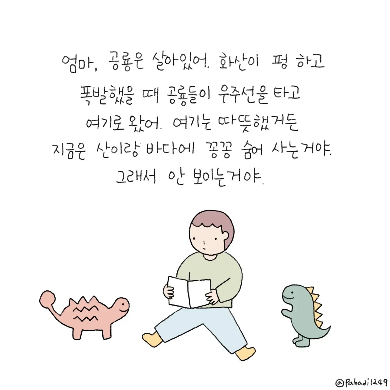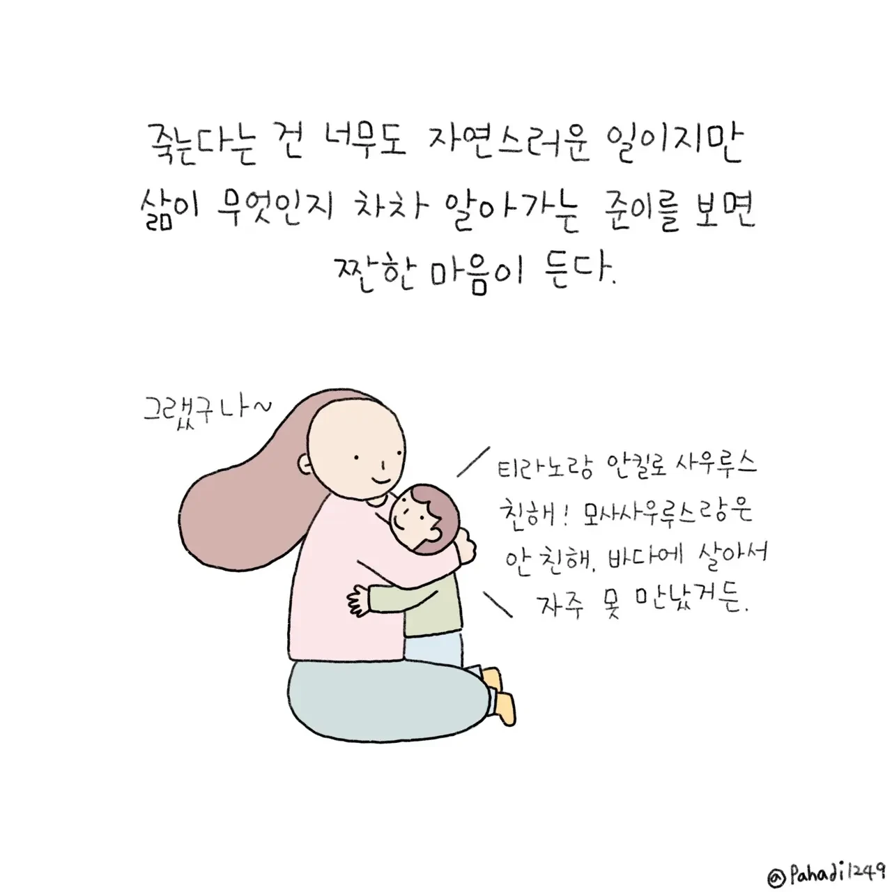 아이가 자라는 모습을 지켜보는 건 행복하기도 하고, 대견하기도 하고, 애타기도 하고, 뭉클하기도 하고, 짠하기도 하다. 내가 살아온 것처럼 준이도 기쁨과 슬픔, 사랑과 미움, 두려움과 간절함, 보람과 실패를 모두 견디며 살아갈 것이다. 엄마가 해줄 수 있는 건 오직 꼭 안아주는 일뿐.