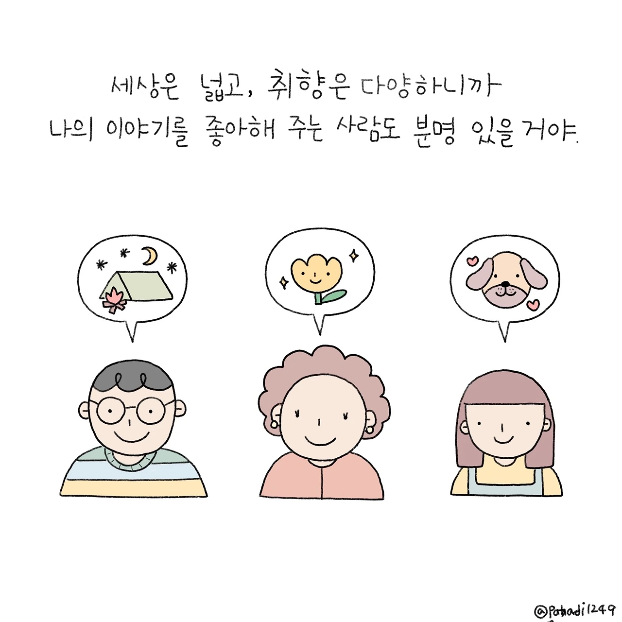 어떤 이야기를 할까 고민하다 보면 가끔 사람들은 어떤 이야기를 좋아할까 고민하게 된다. 하지만 그건 영영 내가 알 수 없는 것! 그냥 우리는 각자 하고 싶은 이야기를 하면 된다. 나는 나의 이야기, 당신은 당신의 이야기♡