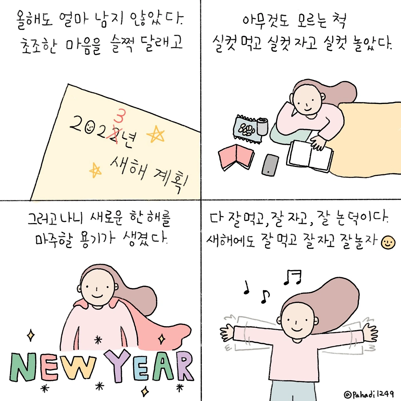 목표 달성의 치트키는 궤도 수정에 있다. 목표 달성이 어려울 것 같으면 재빨리 궤도를 수정하자. 새해 세웠던 계획표에 넌지시 +1을 해 내년 계획으로 삼는다. 인생은 길고 조금 천천히 살아도 괜찮으니까. 누군가 내 글과 그림을 알아주지 않는다면 그냥 나는 홀로 기록할 뿐이라고 시치미를 떼면 된다. 운동을 하겠다는 계획을 못 지켜도 그 시간만큼 빈둥빈둥 정신건강을 챙겼다면 충분히 건강한 하루다.