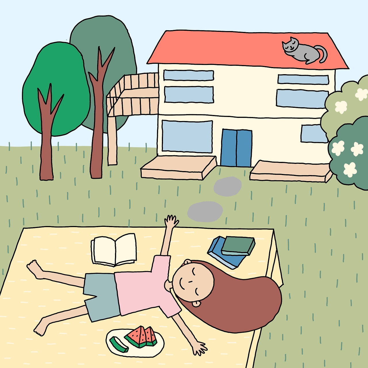 집은 이층 집으로 짓고 옆에 창고도 작게 있으면 좋겠다. 나는 잡동사니들이 너무 많으니까 창고가 꼭 필요하다. 벽돌집은 아니고 벽은 아이보리색, 지붕은 붉은색으로 칠한다. 마당에는 나무랑 꽃을 심을 거고 한쪽에는 텃밭도 만들면 좋겠다. 간단한 채소는 길러 먹으면 좋겠다. 꽃은 계절마다 잘 크는 것으로 골라 심되 작약과 동백나무, 금귤 나무는 꼭 심고 싶다. 야외 테이블과 의자보다는 평상 하나가 좋을 것 같다. 1층은 가족과의 공간으로 사용하고 2층 가장 큰 방은 내 방으로 해야지. 내 방의 세 벽은 모두 책상으로 두를 것이다. 그래서 한쪽에서는 재봉틀을 하고 다른 쪽에서는 그림 그리고 나머지 책상에서는 글을 쓰고 싶다. 마지막 벽 하나는 천장까지 닿는 높은 책장을 올리고. 책장에는 내가 읽은 책으로만 채워야지. 그리고 제일 편한 소파를 하나도 필요한데 어디다 둘까...