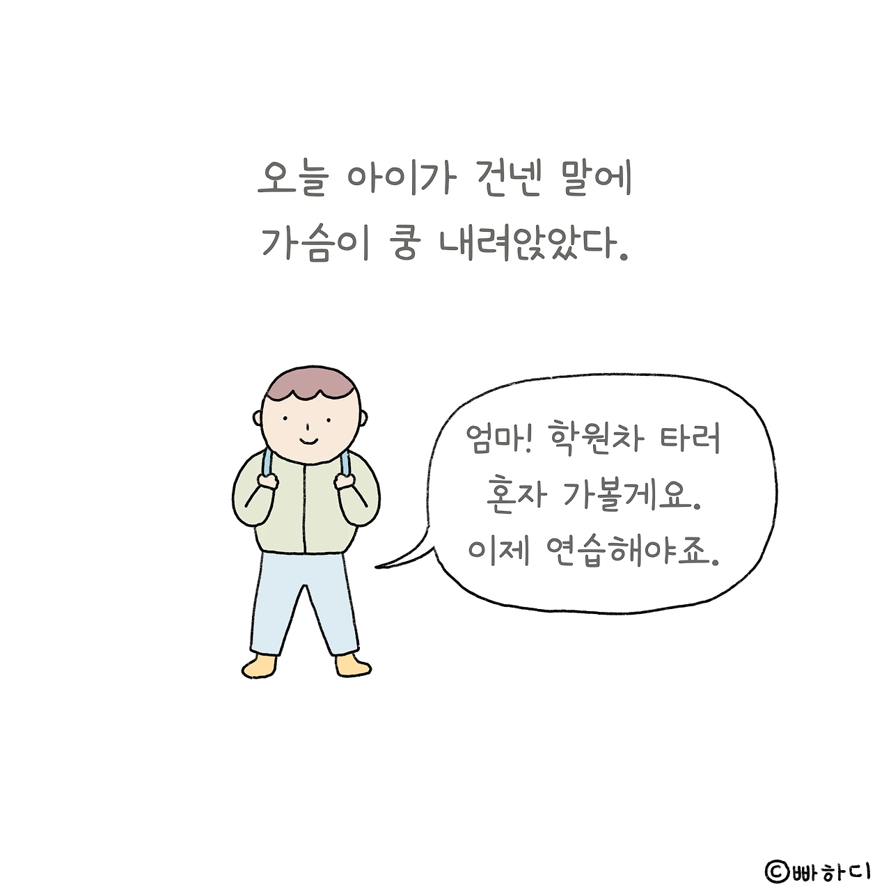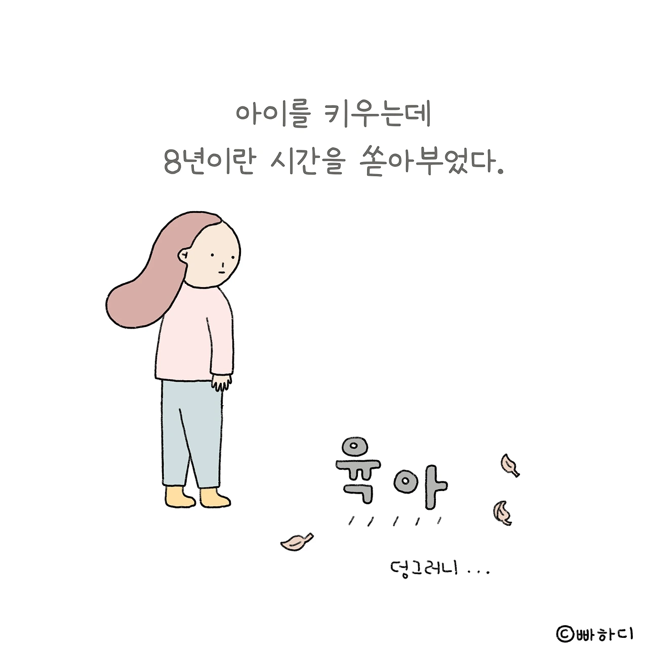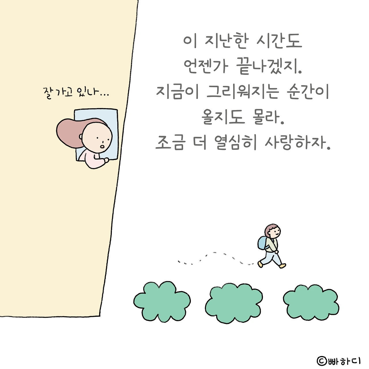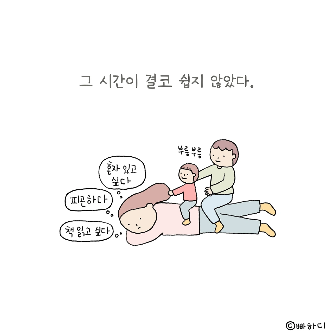때론 의무로, 때론 행복으로 채워온 육아시간이 얼마 남지 않았다. 지겹다고 툴툴대던 마음이 쿵하고 내려앉는다. 곧 이 순간이 간절히 그리워지겠지. 힘들어도 어쩔 수 없던 것처럼 아쉬워도 어쩔 수 없다. 잘 추억할 수 있도록 깊이 음미하자. 너무 후회하지 않도록 열심히 사랑하자.