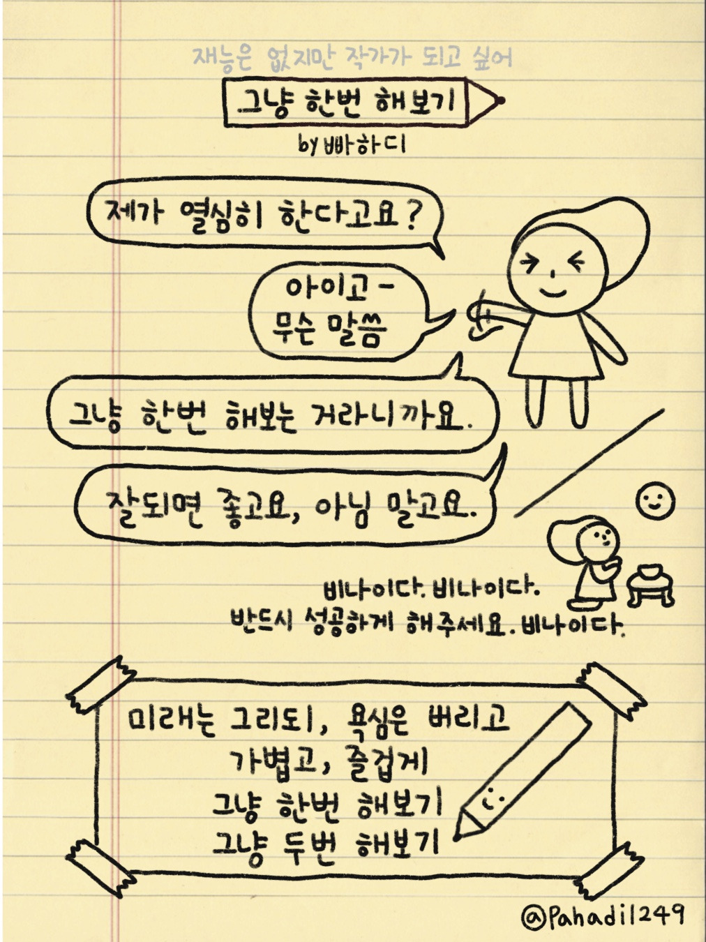 최선을 다하지 않아야 한다. 열심히 하면 기대하게 된다. 기대가 있으면 더 열심히 하고 빨리 지친다. 적당히 해야 계속할 수 있다. 그냥 한 번 해보는 거라고 가볍게 속이자.