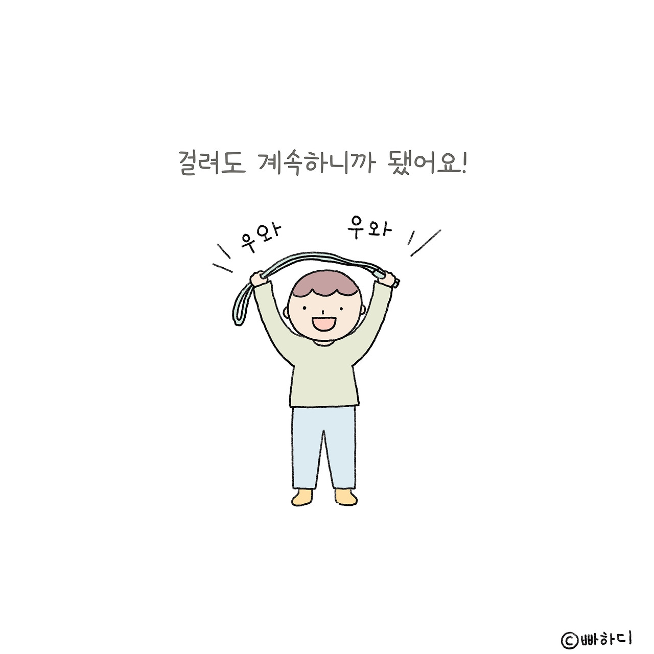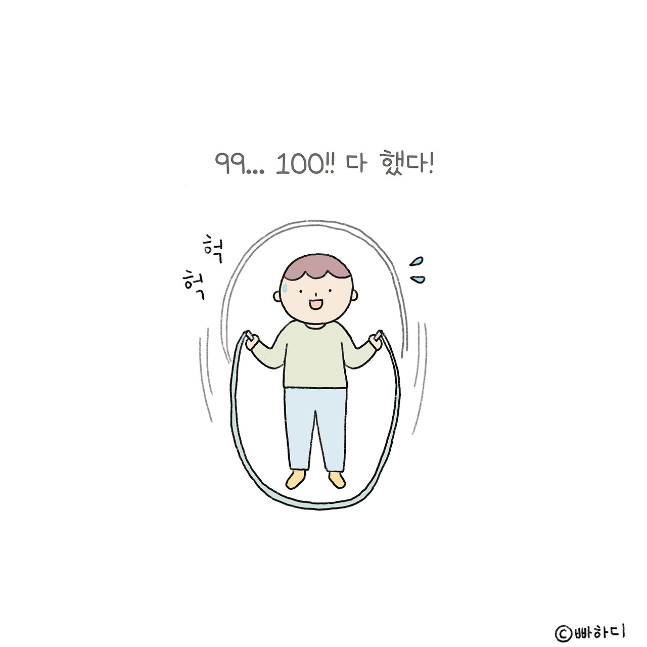 차근차근하다 보면 끝이 온다. 아무리 어렵고 힘들어도 하나씩, 하나씩 넘다 보면 언젠가 100이 된다. 줄넘기뿐만 아니라 모든 일이 그렇다. 그러니 너무 겁내지 말아야지.