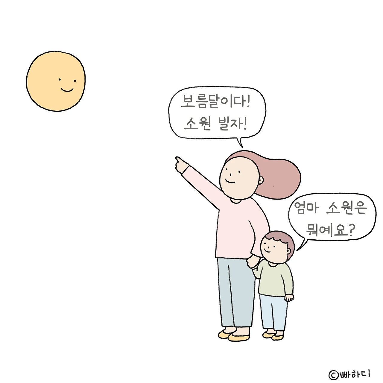 보름달이다! 아이와 소원을 빌기로 했다. 아이가 물었다.