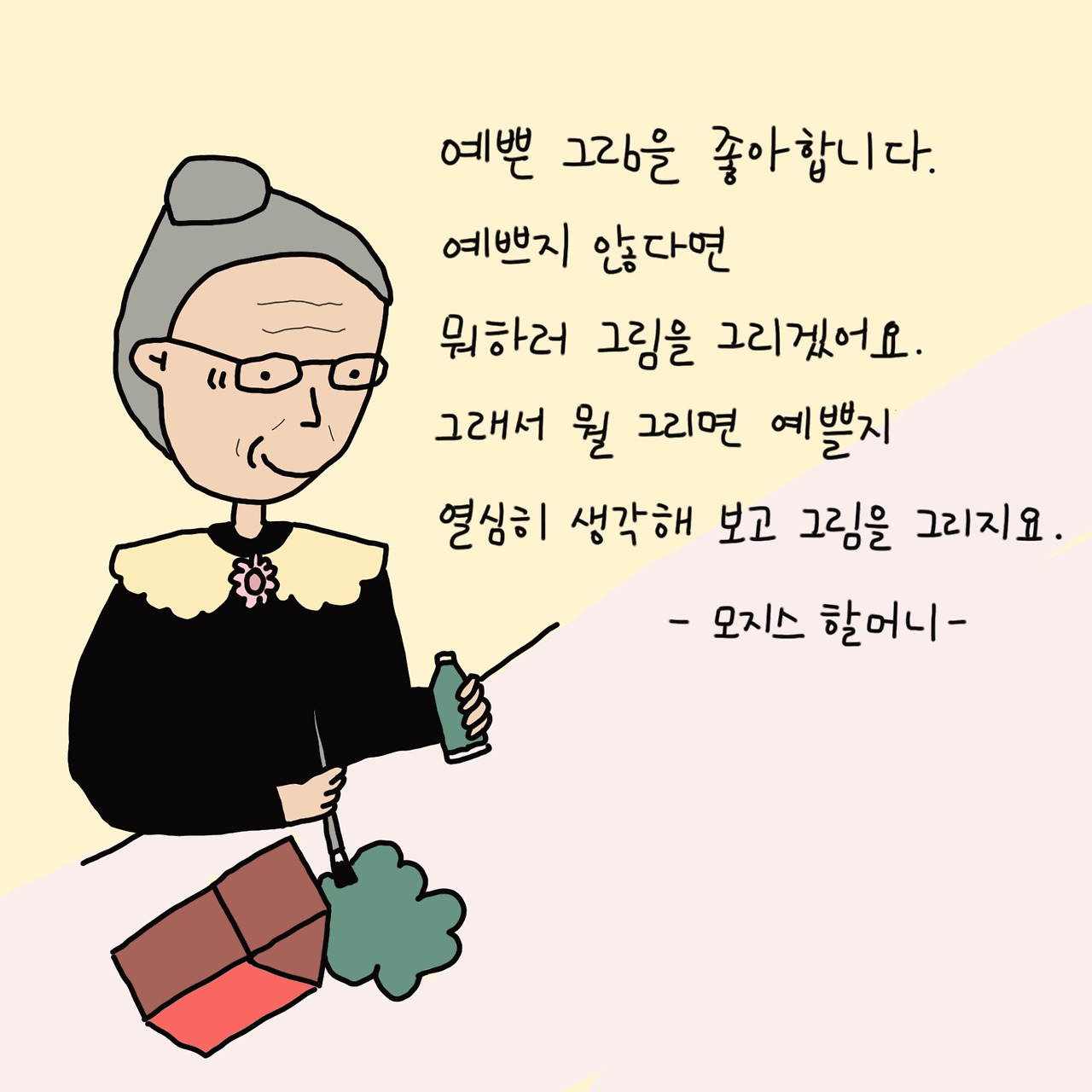 모지스 할머니는 “사람들은 내게 이미 늦었다고 말하곤 했어요. 하지만 지금이 가장 고마워해야 할 시간이라고 생각해요. 무엇인가를 진정으로 꿈꾸는 사람에게 바로 지금 이 순간이 가장 젊은 때이거든요. 시작하기 딱 좋은 때 말이에요.”라고 말한다.