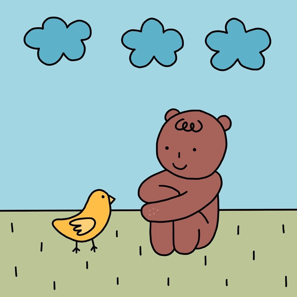 어느새 비가 개고 맑은 하늘이 인사해요. 짹짹 새들도 놀러 나왔네요. 놀기 전에 배부터 든든하게 채워야겠죠? 다정하곰이 새들에게 모이를 나눠줘요. 맛있게 먹으렴♡ illustration with 다정하곰