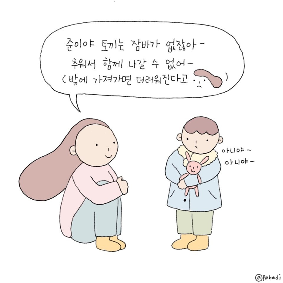 지난번에 '토끼가 잠바가 없어 춥다.' '밖에 나가면 감기에 걸린다.'로 동정심을 유발해 어르고 달랬는데 과연 오늘도 통할지. 오늘따라 토끼를 데려가겠다는 준이와 안 된다는 엄마의 언쟁이 길어진다. 어떤 회유의 말에도 고개를 절레절레 흔들던 준이가 다다다 방으로 들어간다.