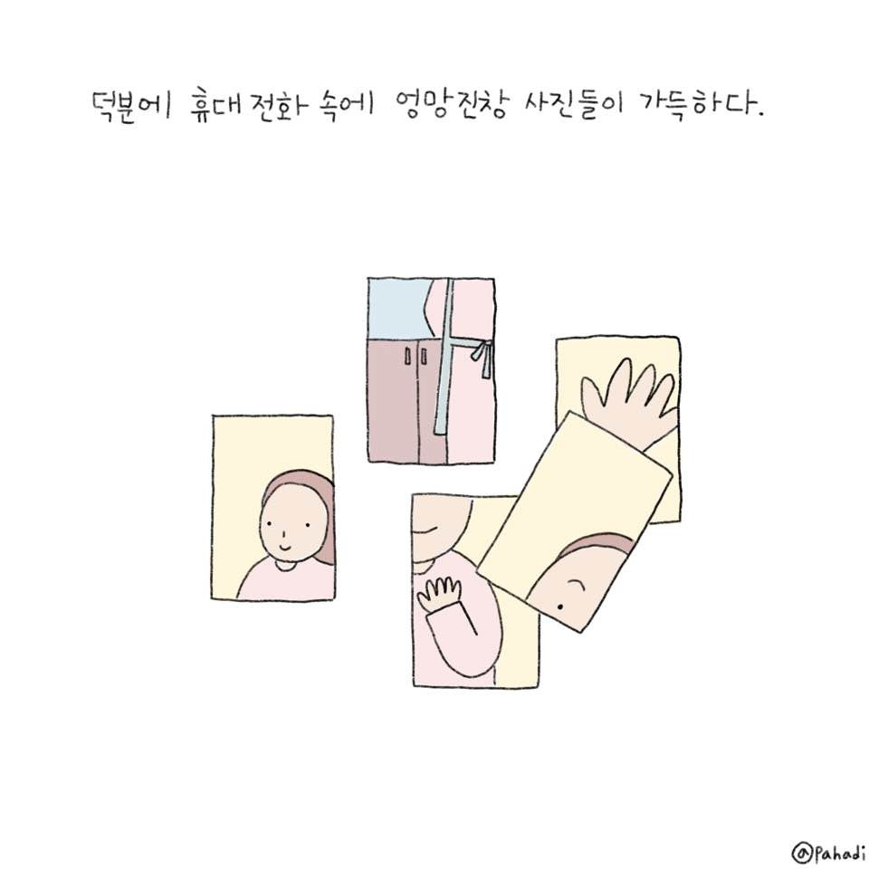 준이를 재우고 초점 안 맞는 엉망진창 사진을 구경한다. 앞치마 입은 엄마 뒷모습 한 컷, 엄마 눈 한쪽 한컷 , 엄마 턱 한컷, 엄마 이마 한 컷...