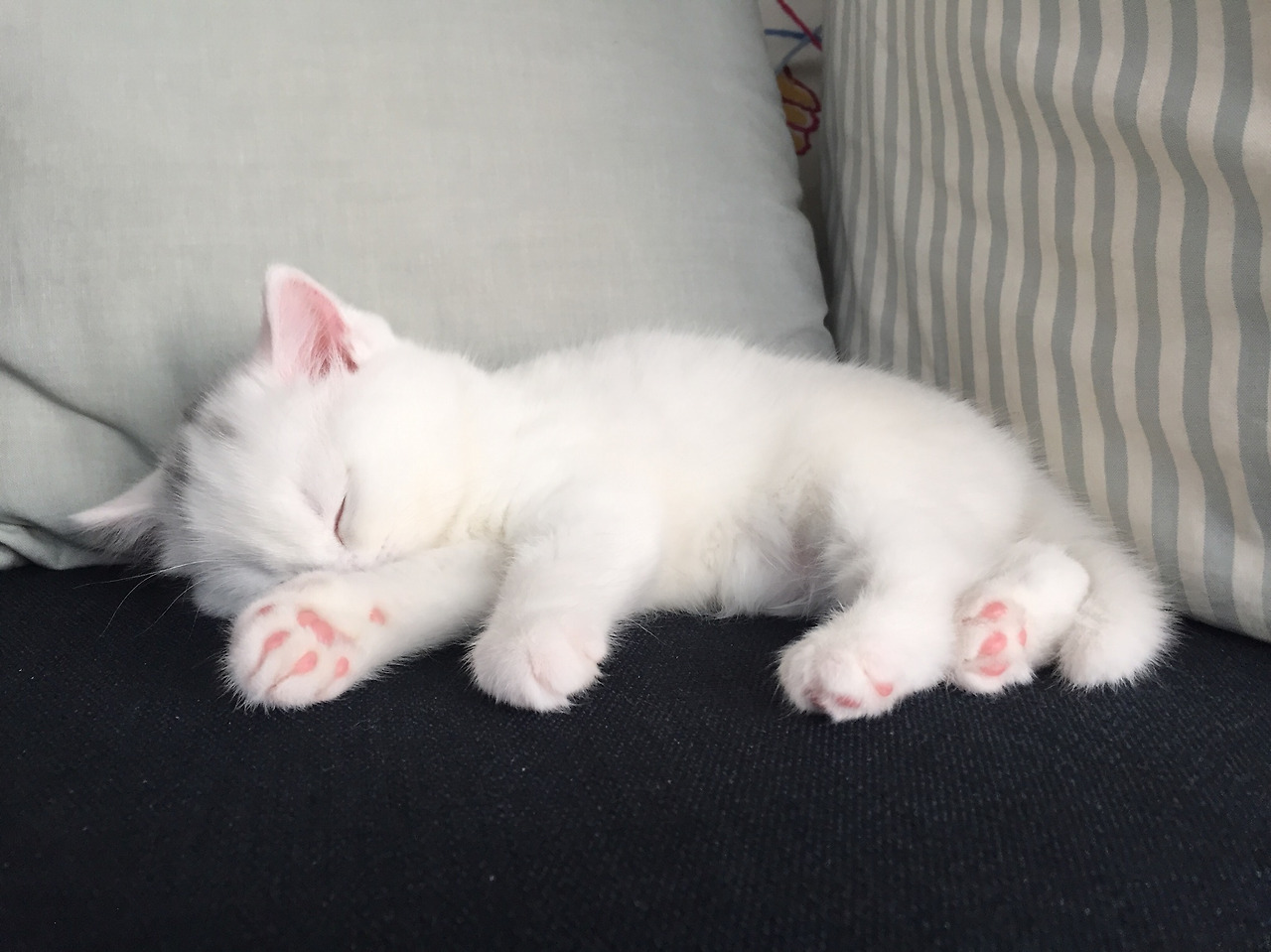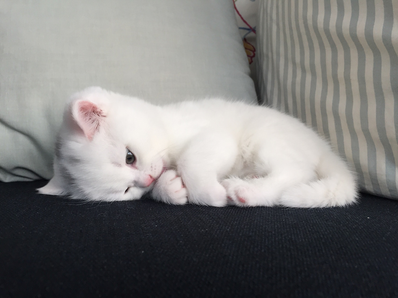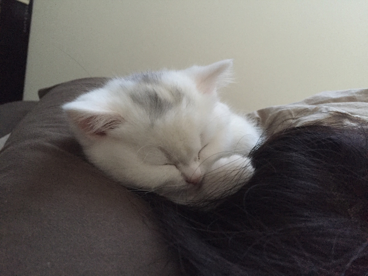 아침에 일어나서 아직 어리둥절한 솜이를 침대로 데리고 왔다. 약간 호러 같은 사진이지만, 베개 위에서 엄마(오늘부터 엄마?)의 머리카락에 파고드는 솜이. 이날부터 솜이의 엄마의 머리카락 사랑이 시작되었다. 왜 고양이들은 머리카락을 좋아하는 걸까. (특히 머리카락을 입으로 가져가는 고양이는 솜이만이 아닌 듯 하여)