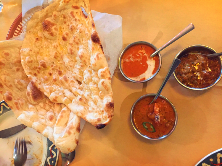 평일런치스페셜에는 사모사(튀김만두 종류), 치킨윙바베큐, 커리, 난 이 포함되어 있음. 세 명이서 치킨마크니, 페퍼프론(통후추 새우커리), 팔락 파니르(치즈 시금치 커리) 와 플레인난, 갈릭난, 버터난 을 골고루 선택해서 나눠 먹었다. 쌀밥도 알아서 갖다주시고, 후식으로 라씨도.