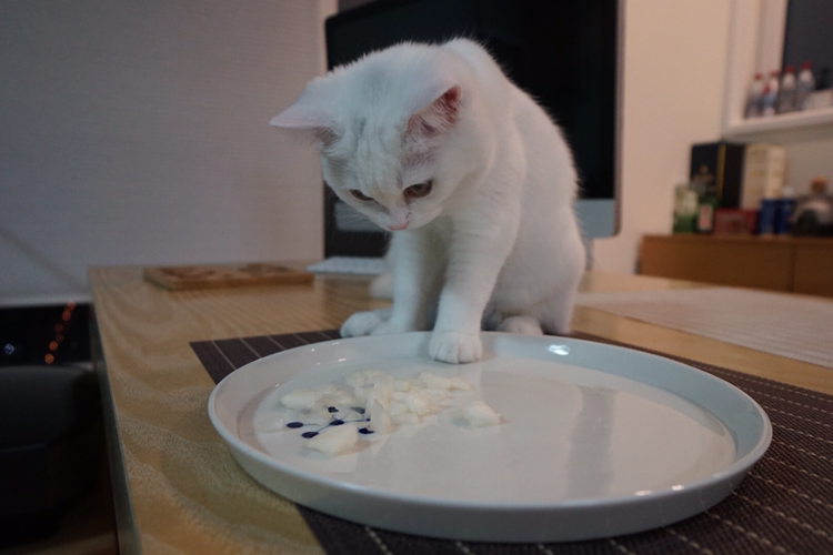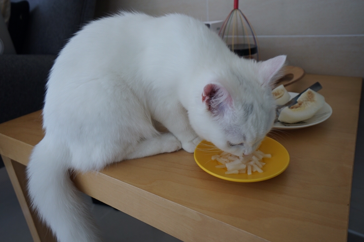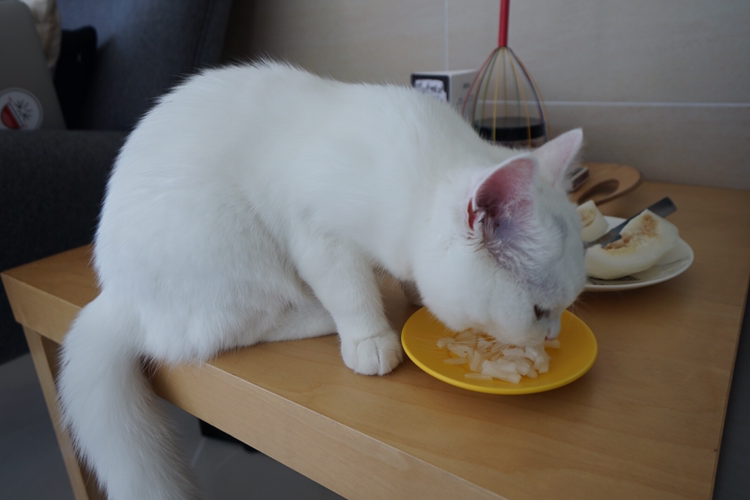 그리고 가끔은 밥으로 주식캔을 준다. 건식 사료만 먹으면 질릴 것 같기도 하고 (나라면 -_-), 습식 사료가 수분 공급에 좋다고 해서. (하지만 습식 사료는 치아 관리에 취약하다고 함. 양치질을 더 잘 해줘야). 캔 한개 뜯으면 냄새 맡고 얼른 달라고 냥냥 거린다. 근데 한번에 많이 먹어야 캔의 1/3 정도 먹음. 심지어 신나게 냄새 맡고 당장은 안 먹고 나중에 먹을 때도 많음. 배가 안 고플 때 뜯어서 그런가-_- 역시 식탐이 없어... 캔도 오리, 토끼, 치킨, 소고기, 연어, 참치 등등 내용물이 다 달라서 기호성(반려동물 식성을 부르는 말)을 보고 먹어야 한다는데, 솜이는 딱히 엄청 좋아하는 것도 싫어하는 것도 아직은 모르겠다. 반응이 때에 따라 다 다름 -_-