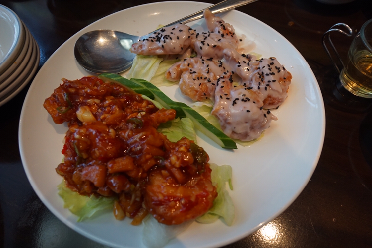 칠리새우와 크림새우가 반반 나오는 원앙새우. 오동통한 새우가 식감이 너무 좋았음.