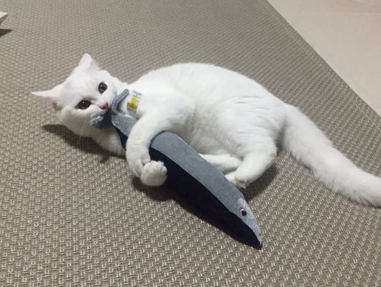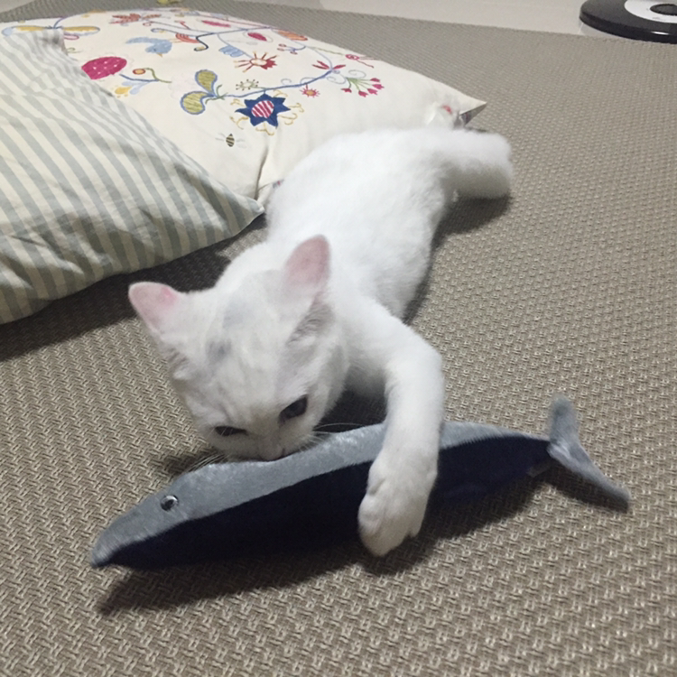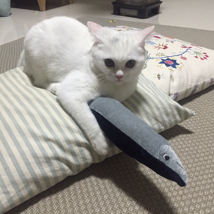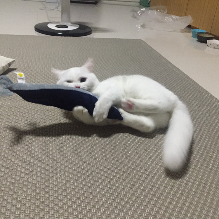 이 인형이 바스락꽁치 인형인데, 안에 바스락거리는 비닐 소재 같은 게 들어있어서 만지면 바스락바스락 소리가 난다. 첫 날만 엄청 재밌게 갖고 놀고, 담 날부터는 그냥 쏘쏘. 갖고 놀아주면 좋아하긴 하는데 혼자 놀진 않는다. 페츠루트 덴탈스틱은 신나면 혼자 던지고 물고 난리가 남.