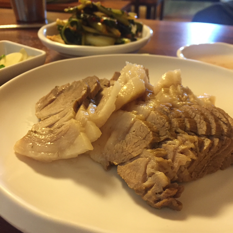 수육 작은 접시 12000원. 고기는 보드라운 스타일로 너무 부드러워서 입에서 살살 녹는다. 얇게 편으로 썰어낸 마늘과 맵지 않은 채썬 고추가 함께 나와서 곁들여 먹기 좋았다. 두툼한 마늘은 매워서 못 먹는데 이렇게 나오니 생전 처음으로!! 고기와 생마늘을 같이 먹어본 듯. 두 명이 고기에 곁들여 먹기 딱 좋은 만큼의 접시다. 새우젓과 쌈장이 함께 나옴.