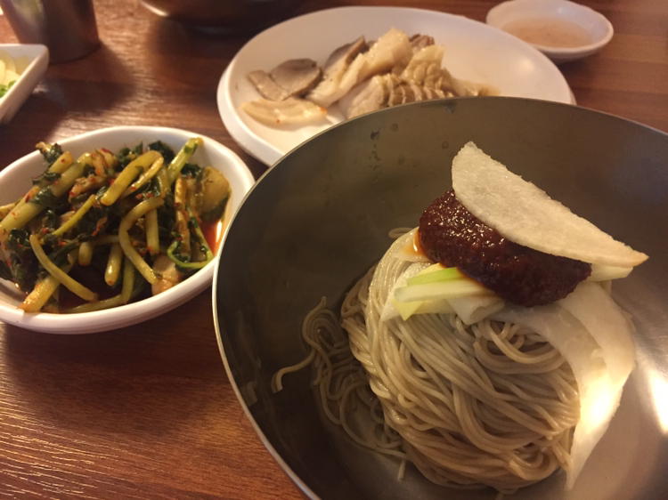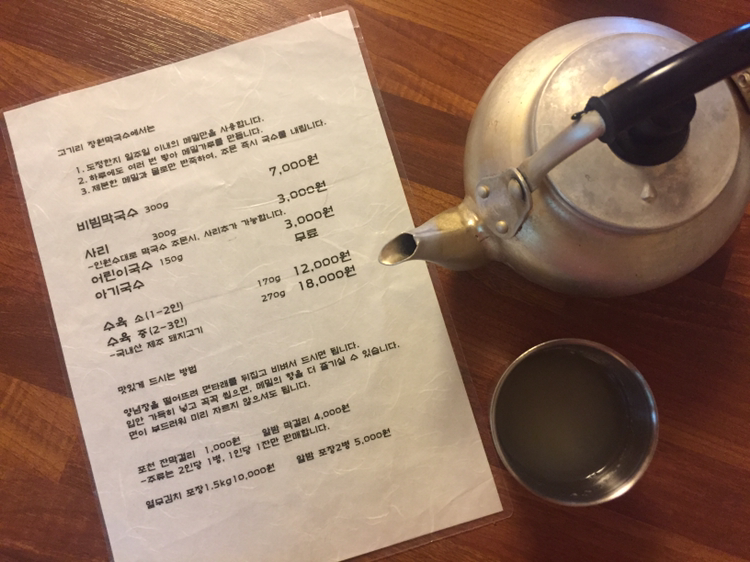 비빔막국수와 수육을 주문했다. 여름이지만 따뜻한 면수가 주전자로 서빙되었다. 심심하고 구수한 맛. 더운데도 뜨거운 물이 거슬리지가 않네? +_+