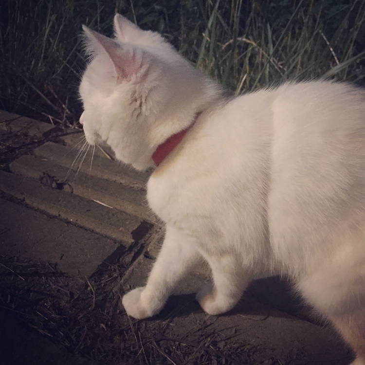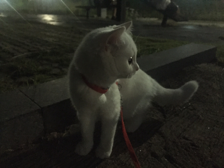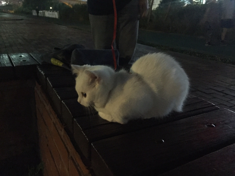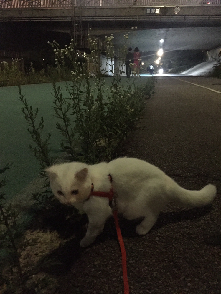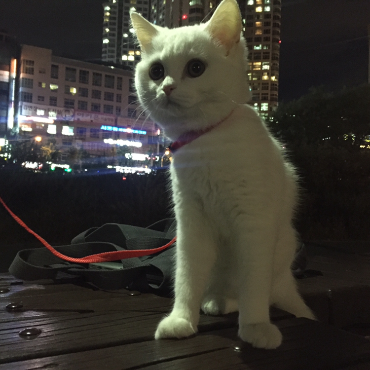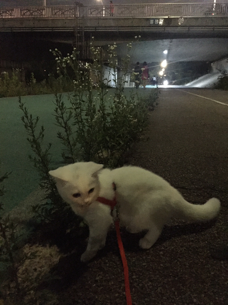 집에서부터 탄천 산책로로 내려가기 전까지 안겨가는 길에선 잠시 긴장했다가 산책로에 도착해서 바닥에 내려주면 풀 냄새를 맡고 풀잎을 뜯고 벌레를 쫓아다닌다. 그리고 소란스러운 낮보단 밤의 차분한 분위기를 더 좋아하는 것 같음.