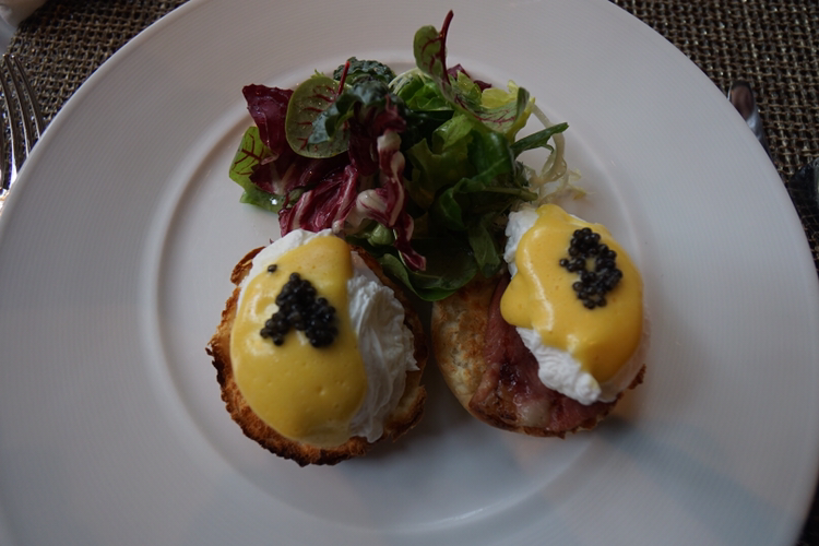 그밖에 1인 당 브런치 요리를 1가지 선택할 수 있는데 먼저 캐비어가 올라간 에그 베네딕트를 골랐다. 에그 베네딕트에서 특이한 풍미가 났는데 햄 맛인지, 독특해서 좋았다. 아.. 캐비어였을 수도 ㅋㅋㅋ 왜 난 햄의 맛이라고 생각했지 ㅋㅋ