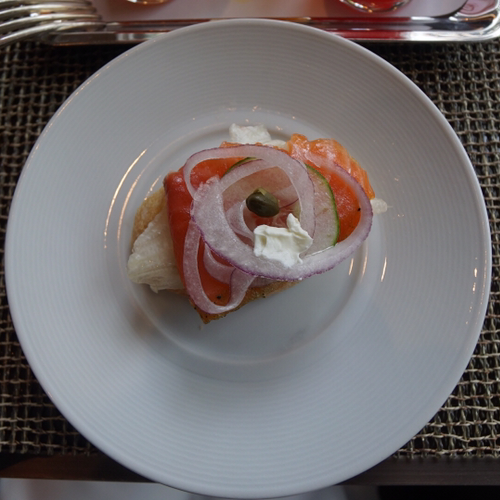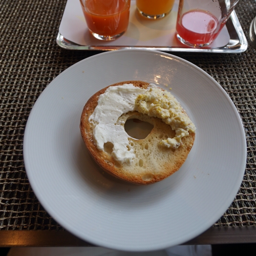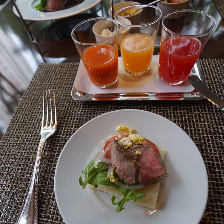 먼저 과일 쥬스 3종이 서빙되었다. 당근쥬스, 오렌지쥬스, 수박쥬스. 그리고 로스트비프/훈제연어/야채가 각각 담겨있는 3단 트레이와 베이글/바게트/치아바타 등이 담겨있는 빵바구니, 피클과 으깬감자계란샐러드, 크림치즈가 함께 나왔다. 취향에 맞게 빵과 고기, 야채 등을 샌드위치로 만들어 먹으면 된다.