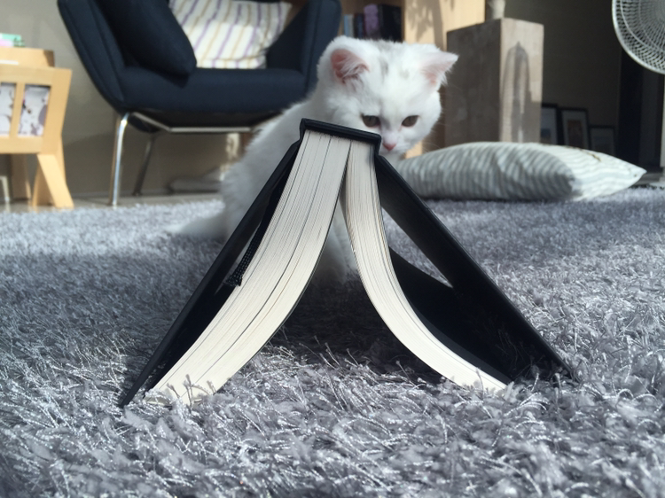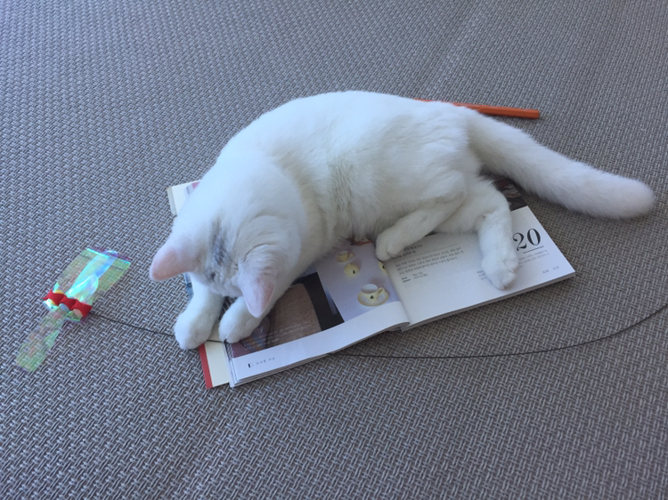 그리고 책을 보고 있으면 꼭 와서 방해를... 아예 책 위에 올라갔다가 책 아래에 손을 넣고 휘져었다가 넘기는 책장을 물기도 하고 책갈피끈을 씹기도 하고. 그러다 보면 나는 책을 보는 건지, 솜이랑 놀아주는 건지. 하여튼 솜이가 오고 책을 덜 읽고 있다 ㅋㅋ 노느라 바빠서. 대신 고양이와 책의 콜라보 사진을 많이 건짐.