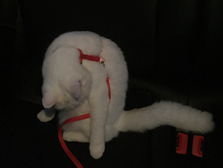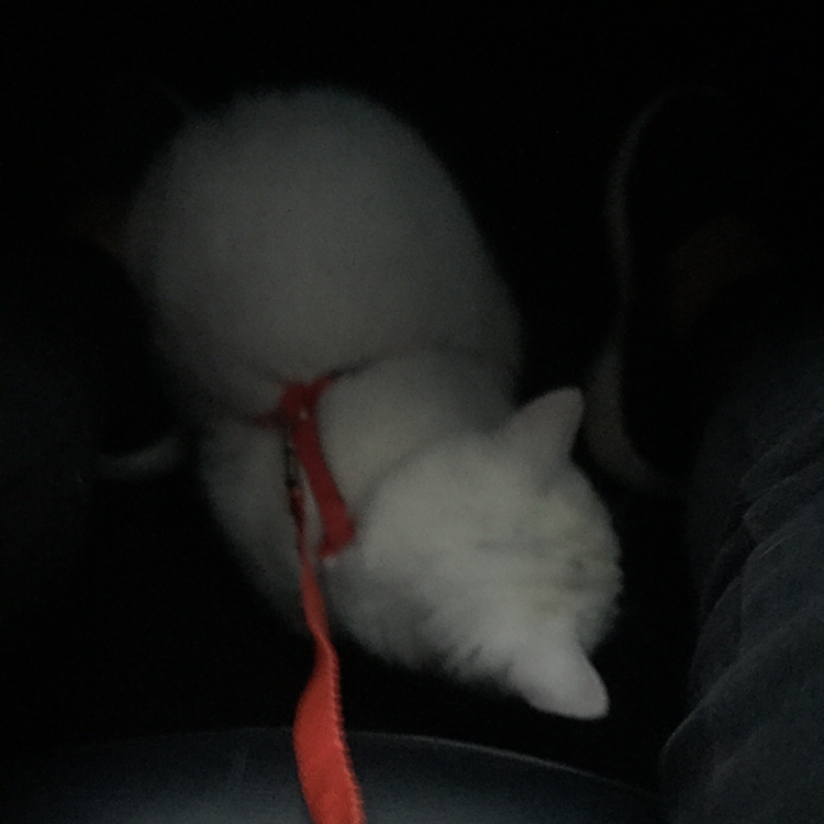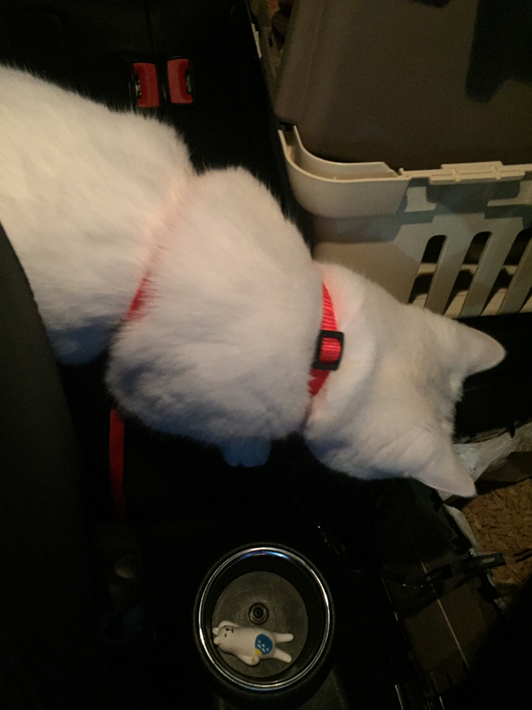 곧 다시 슬금슬금 일어나서 뒷좌석을 탐방하기 시작했다. 이동 화장실로 만들어온 박스에도 들어가보고, 창문에 기대어 일어나서 차 밖 구경도 하고, 뒷자리 좌석에 앉아 그루밍도 하고, 아예 뒷자석에 자리잡고 앉기. 그래도 어디로 튈지 몰라 몸줄을 짧게 쥐고 차 흔들림에 솜이가 넘어질라 노심초사.