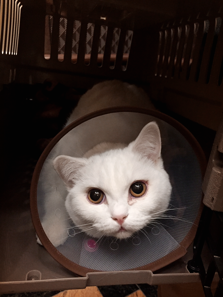 병원에 도착했더니 솜이가 애처롭게 ㅠㅠ 기다리고 있었다. 굳은 표정과 눈물 자국 ㅠㅠ 수술이 끝나면 수술 부위를 그루밍하면 안되니까 기본적으로 넥카라를 씌워준다. 상처가 벌어져서 병원에 돌아오는 경우도 있다고 >_<