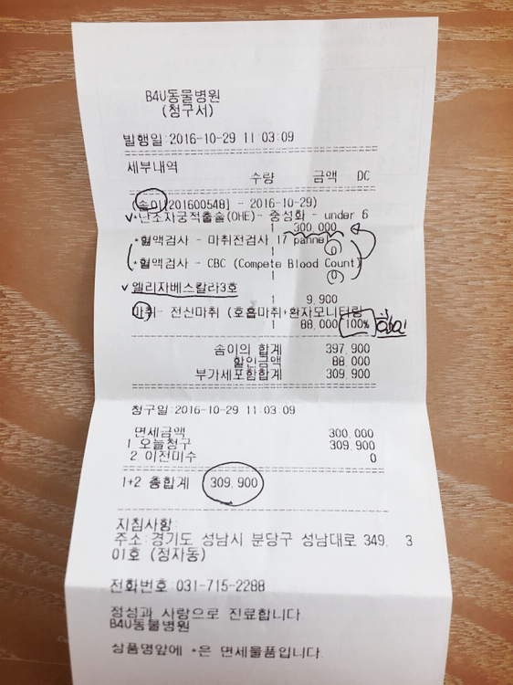 수술은 수술 전에 하는 기본검사와 고급(?)검사 에 따라 24만원, 30만원 정도로 나뉘어있었던 것 같은데 그땐 듣고 끄덕끄덕했는데 기억이 안남 ㅋㅋ 내부 장기 검사가 좀더 포함되어 있는 가격대가 더 비싼 패키지를 선택했다. 이런 게 엄마 아빠의 마음일까, 잠시 생각함