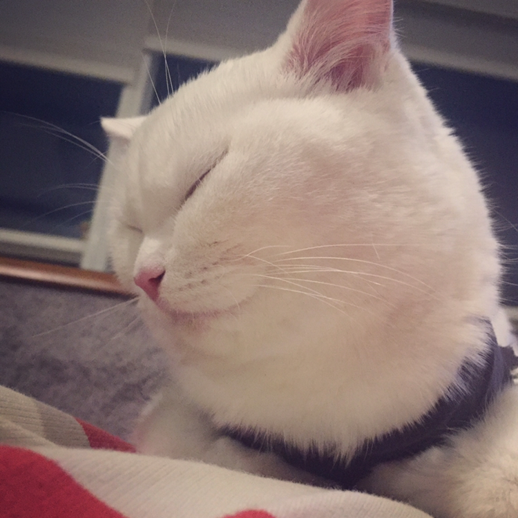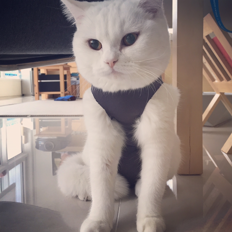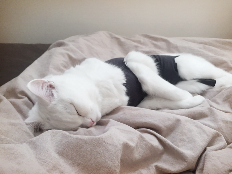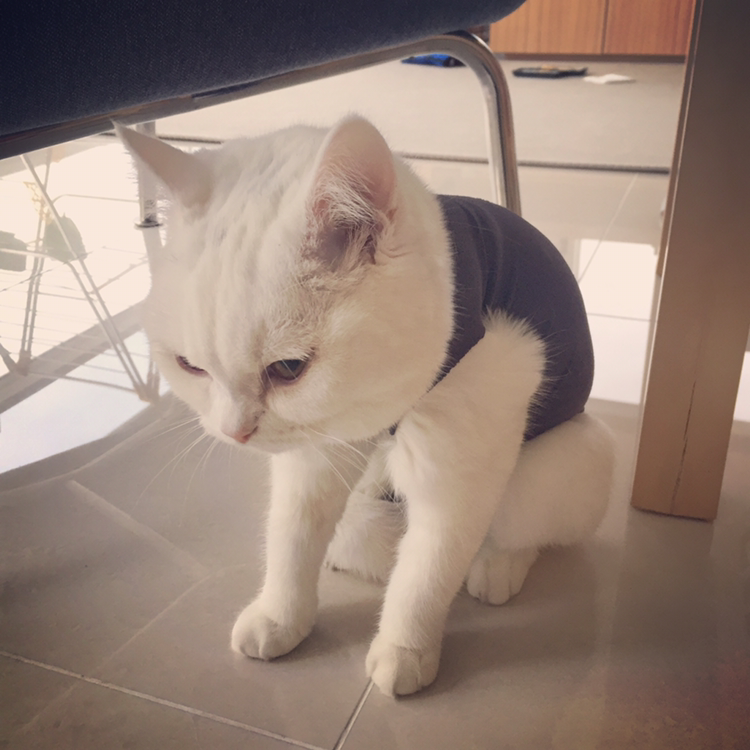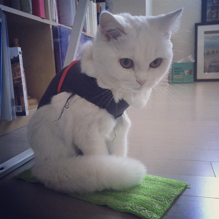스타킹으로 만든 환묘복은 점점 늘어나서 솜이가 그루밍을 하다보면 벗겨졌다 ㅋㅋ 내가 보고 있을 땐 얼른 다시 입혀주면 되는데 하루 종일 출근해있을 땐 격하게 그루밍하다 상처 벌어질까 걱정되어서 평소 산책 때 사용하는 몸줄을 헐겁게 착용해주고 목부분 잠금장치에 옷자락을 낑겨넣어서 옷이 흘러내리지 않게 했다.