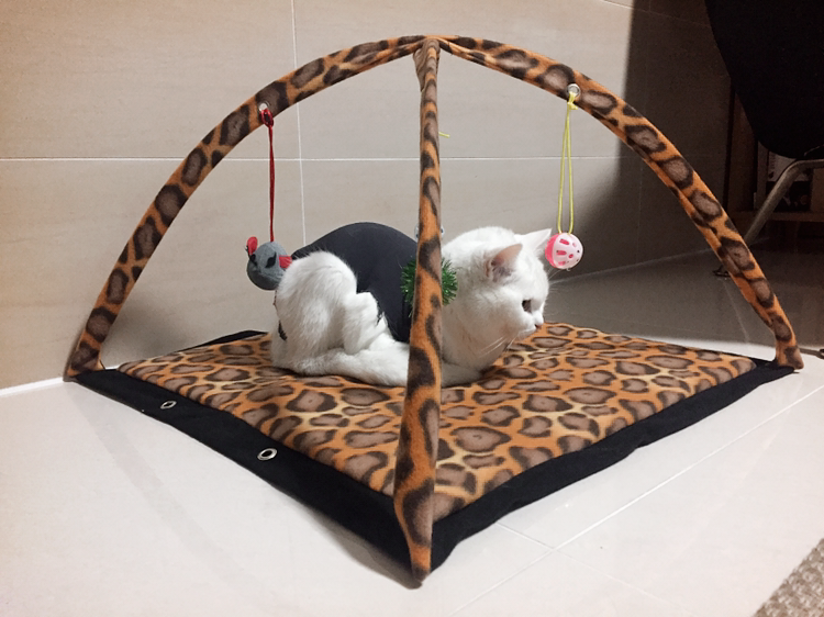 수술하고 며칠 후 퇴근하고 들어가는 길이었는데 서둘러 다이소에 들러서 득템했다. 좀... 못생겼지만 괜찮아.. 솜이가 좋아하잖아 ;ㅁ; 매달려있는 구슬 공과, 쥐인형을 손으로 치고 논다.