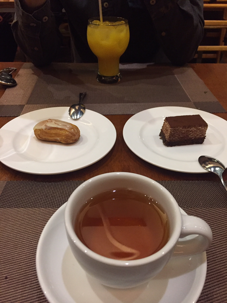 그리고 디저트로 에클레어와 티라미수가 나왔는데 정말정말 맛있었다. 음료는 오렌지쥬스와 홍차로 선택.