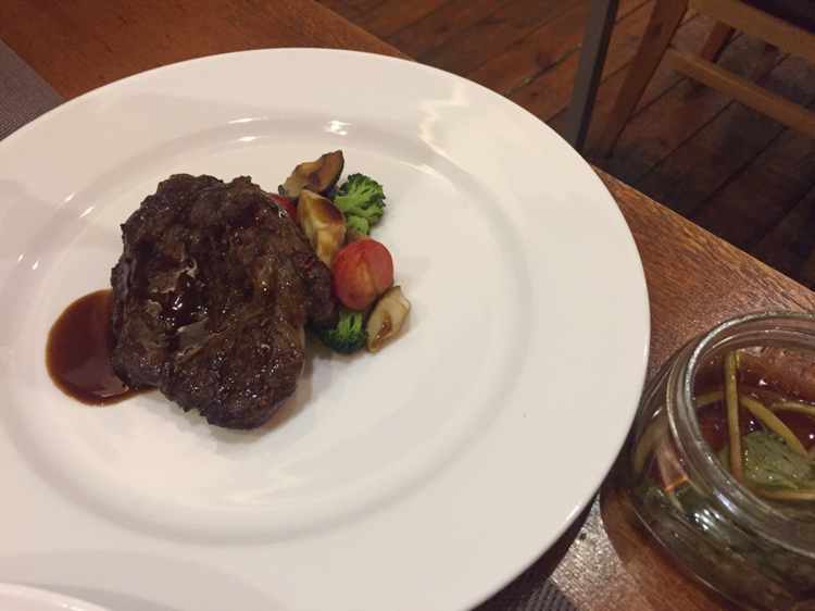 꽃등심 스테이크. 생와사비잎 장아찌가 같이 나오는데 특색있고 고기와 잘 어울린다. 스테이크도 무난.