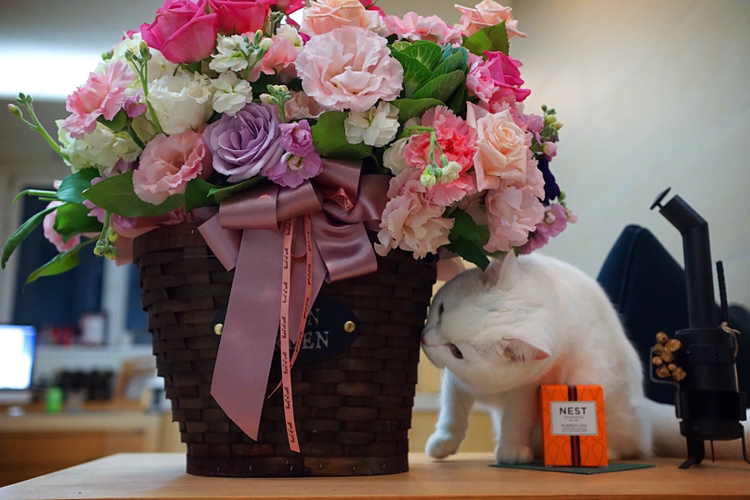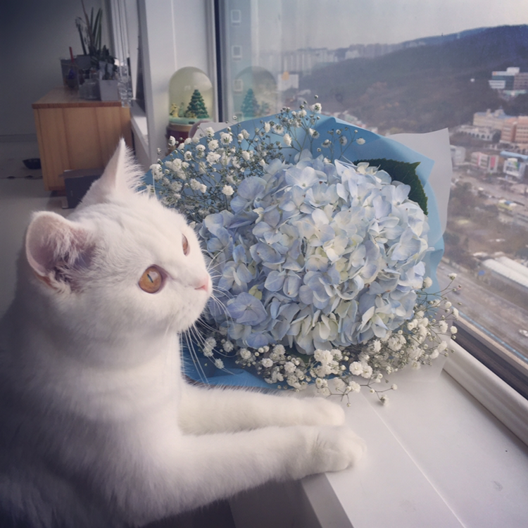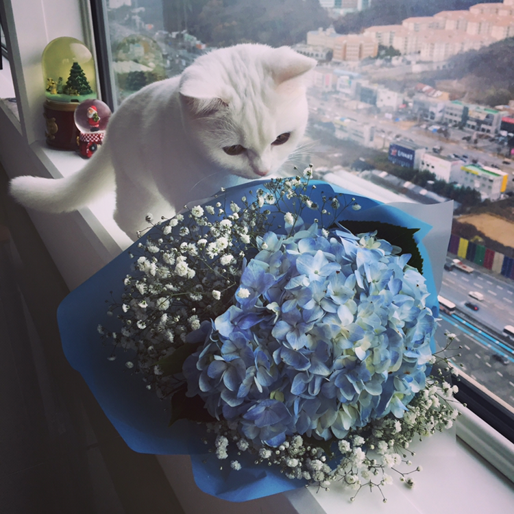 생일 때 받은 수국 꽃다발. 하얀 솜이가 근처를 어슬렁거리는 풍경이 그림 같다.