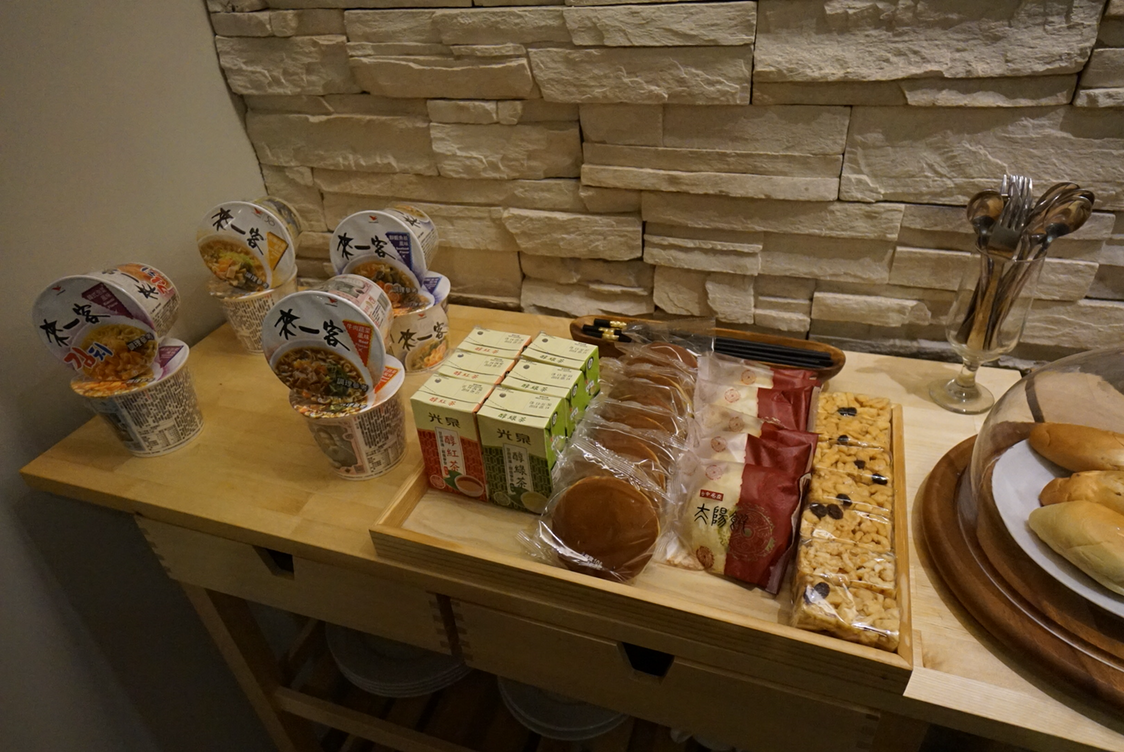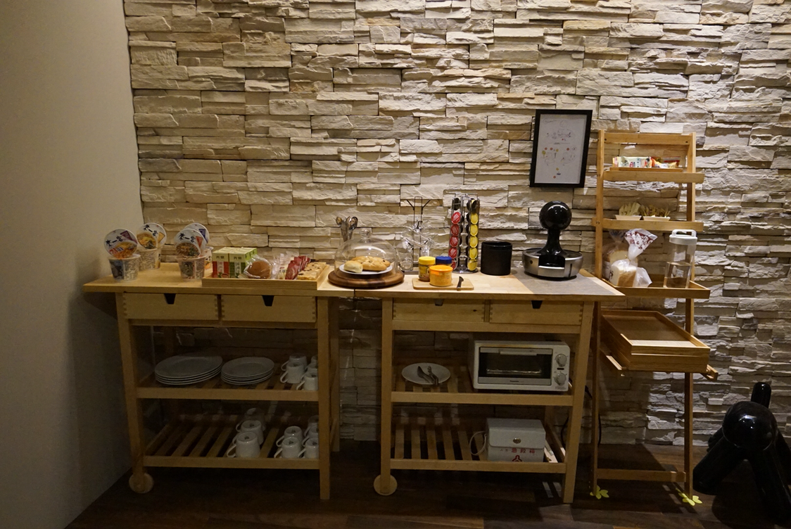 입구 층보다 한 층 위로 올라간 곳에 놓여져있는 푸드들. 컵라면, 캡슐커피, 쥬스, 빵, 과자... 입실할 때는 이렇게 꽉꽉 채워져 있었는데 다음날 아침에 조식으로 먹으려고 갔더니 거의 없었음 ㅋㅋ. 다행히 전달 저녁에 몇개 챙겨둔 게 있어서 잘 먹었다.