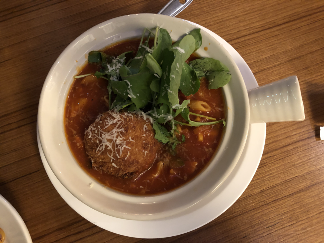 치킨토마토스튜. 어떤 음식이 나올까 궁금했는데 걸쭉한 토마토 스튜에 숏파스타와 튀긴 주먹밥 (아란치니?) 가 들어있고 루꼴라와 치즈가 뿌려진 요리가 나왔다. 향기부터 대만족~ 국물요리에 밥이 들어있어 적당히 한끼가 되면서 맛도 좋았다. 따뜻한 국물 생각날 때도 적절할 선택.