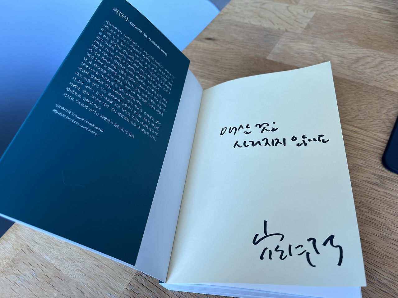 최인아책방 선릉점에 북토크를 들으러 간 김에, 최인아 책방마님이 최근에 쓰신 책이 저자 싸인본으로 서점 입구에 놓여 있어서 집어 들게 된 책이었다. 속지에 싸인과 함께 “애쓴 것은 사라지지 않아요”라는 손글씨가 쓰여 있었다.
