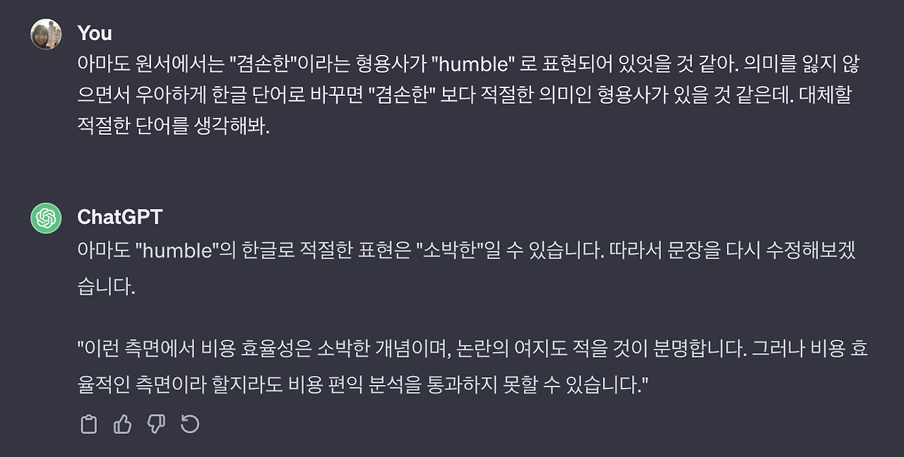 예를 들면 아래 같은 단락에서 "겸손한"이라는 형용사 선택.. 원문의 단어는 humble이었으려나? 무생물인 효율성이 겸손하다는 게 무슨 의미인 건지 바로 와닿지가 않는다.