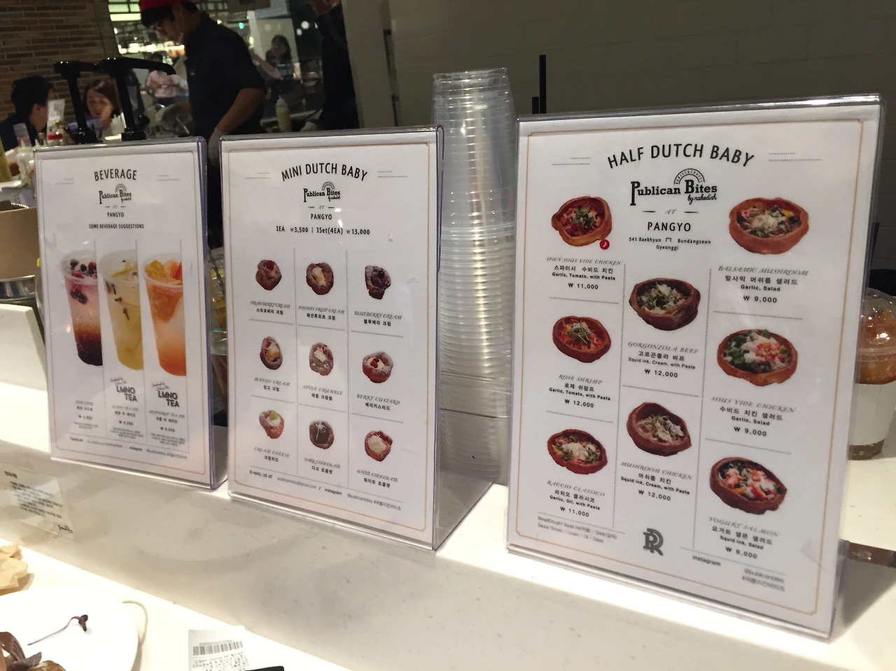 맹기용 쉐프의 상수동 퍼블리칸바이츠가 판교 현대백화점 지하 식품관에 들어와 있더라. 메뉴는 살짝 다른 것 같은데, 식사류 로는 빵 속에 들어있는 샐러드/파스타 종류가 있었고, 디저트류로 커스터드 파이 같은 게 있었다.