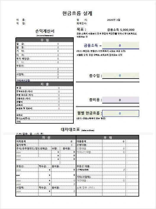 현금흐름 설계의 가장 중요한 목표와 금융소득칸을 확인했다면이제 좌측에 있는 손익계산서와 하단에 있는 대차대조표를 정리할 단계이다.