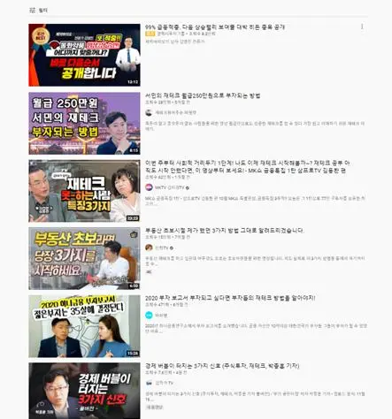 그러니 주변에 물어보지 말자. 그 방법들을 이야기해 줄 사람이 너무도 많으니 걱정할 필요가 없다. 재테크를 시작해야겠다고 마음을 먹고 가장 쉽게 할 수 있는 방법은 어떤 재테크 전략이 있는지 조사하는 것이다. 그 중 가장 쉬운 방법은 바로 유튜브 재테크 영상들을 찾아보는 것이다.