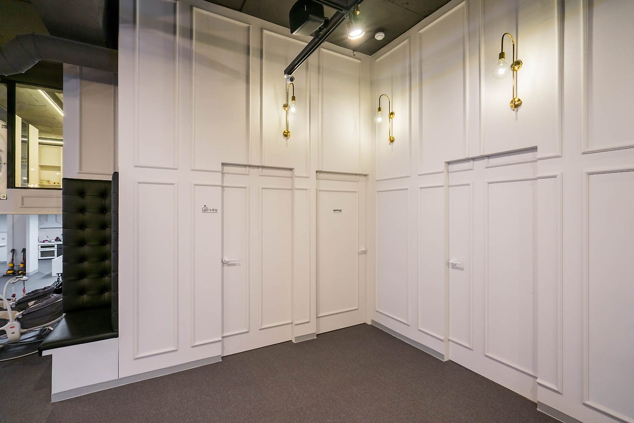 웨인스코트를 적극이용하길 바라셨으며 , 조금 더 클래식한 느낌을 넣어 , 2가지 버전으로 앞으로 가맹점주들을 모시고 싶다는 바램을 얘기해주셔서 그에 맞추어 조금 디자인을 수정하여 전체적으로 진행되었습니다.