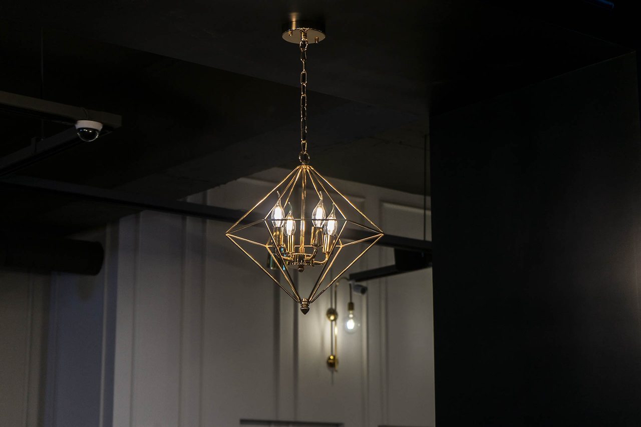 양기둥 사이 공간을 이용한 이번 키즈카페인테리어의 메인 라이팅 자리 입니다. 골드 색상 미니 샹들리에 등을 달아 메인 라이팅 포인트를 할애한 공간입니다. 클래식해 보이는 촛등형태의 전구가 달려 컨셉과 잘 맞게 떨어졌습니다.
