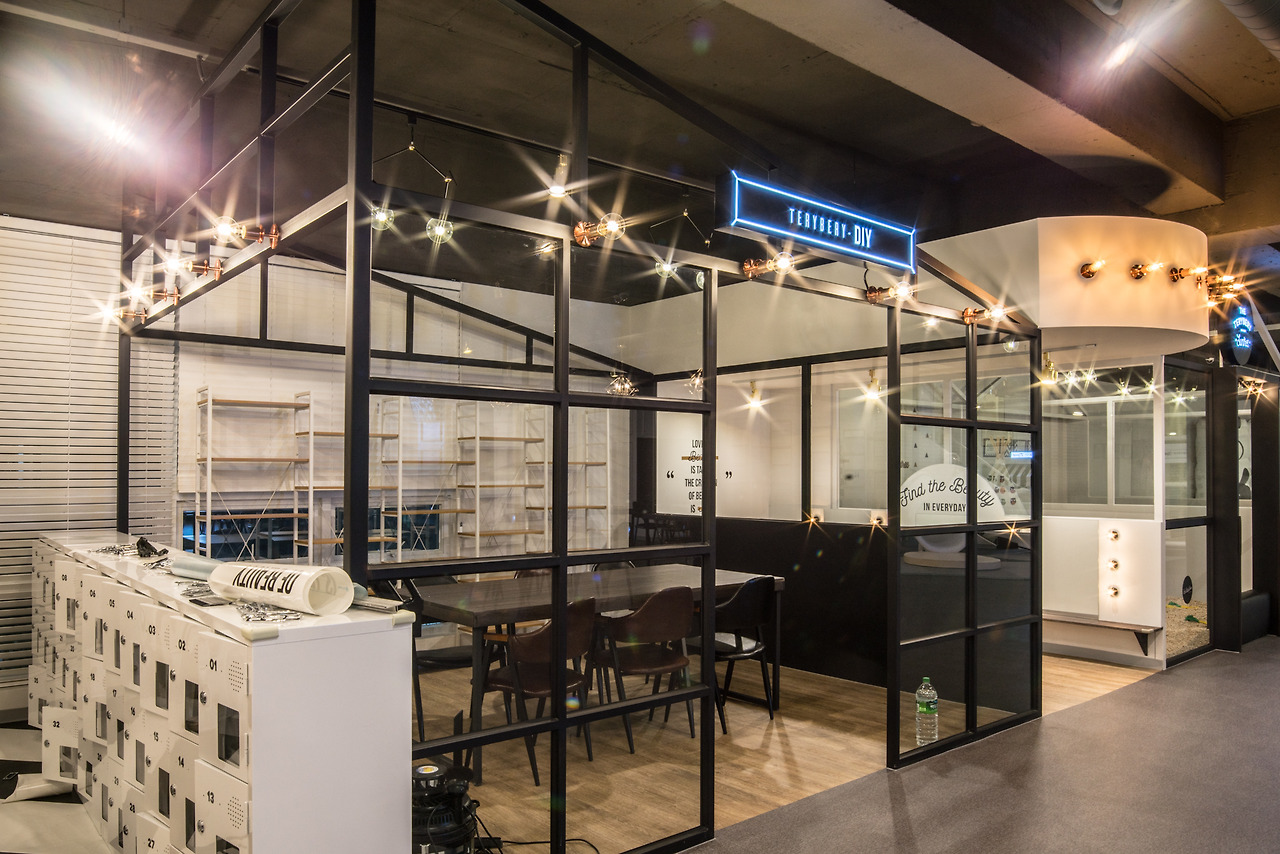 DIY존 모습입니다.아이들이 만들기, 그리기 등을 하는 키즈 카페 인테리어에 빠질 수 없는 공간이기도 하지요,프렌치도어 형태의 챠콜색상 철제프레임으로 제작되었습니다.