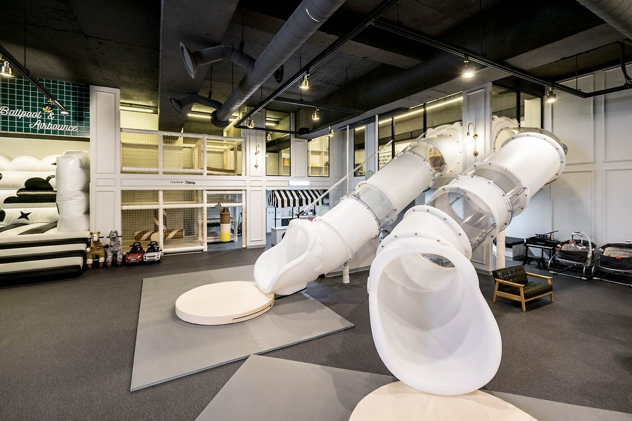아이들이라면 누구나 좋아하는 미끄럼틀입니다. 역시나 이번 키즈 카페 인테리어의 모노톤인 컨셉에 맞도록 화이트와 투명 두톤으로만 이용하여 제작하였습니다.투명한 공간을 많이 늘여주고 싶었는데, 투명재질은 내구성에 문제가 있다하여 최대한 타협을 보니 흰색의 원통 슬라이드가 많아져버린 모습이라 조금 아쉽습니다.