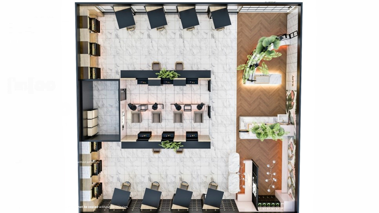 샴푸룸을 둘러싼 미용 공간으로, 실제 시공되었을 경우 되도록 한 공간안에서 많은 손님을 받을 수 있게 계산한 동선에서 나온 미용실 인테리어 결과물입니다.아래에는 샴푸룸 공간을 바닥에서 450 정도 띄워 샴푸룸 설비를 집어넣은과 동시에 외부에서는 하부장으로 쓸 수 있게 계획하였고 빈공간에는 플렌테리어를 아래위로 넣어 전체적인 플랜테리어 컨셉을 조금더 강조하여보았습니다.
