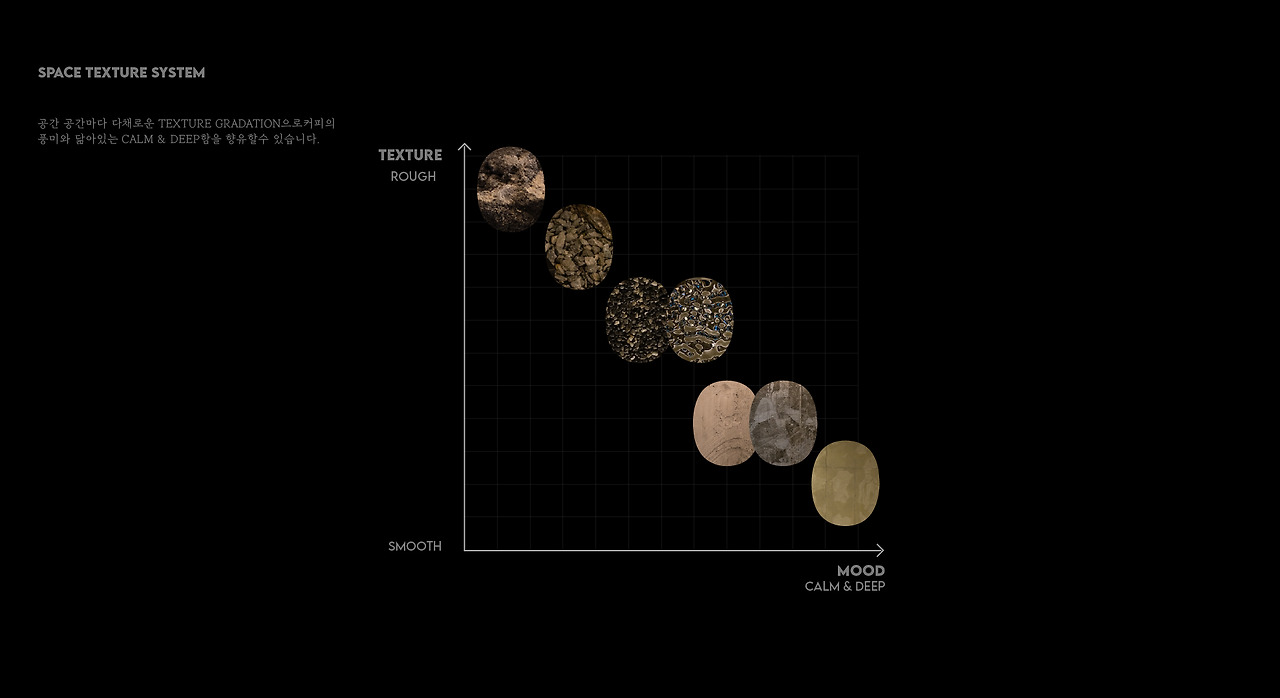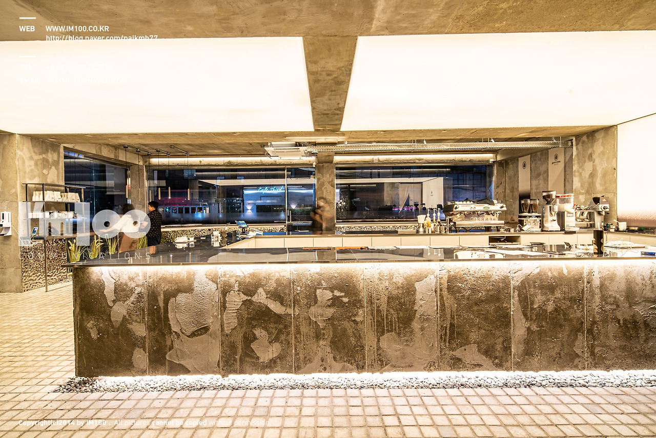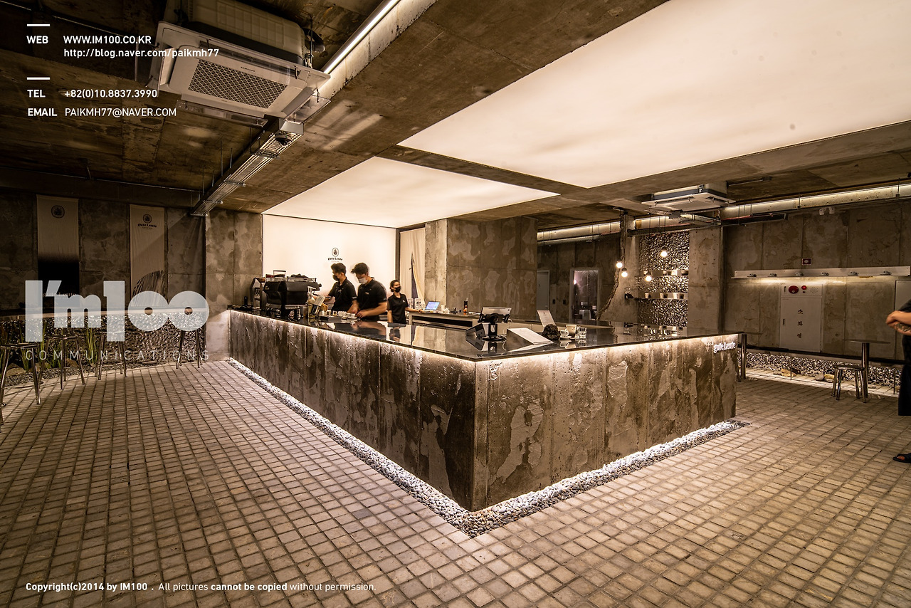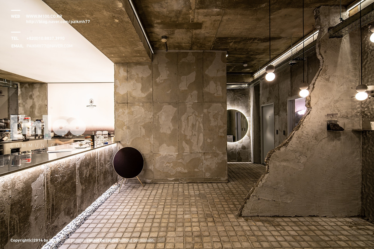 카페인테리어 내 쓰인 소재와 자재들은 커피가루의 거친 질감을 간접적으로 느끼게 해주려 러프한 자재들을 이용하였습니다. 벽면은 전체 콘크리트 폼을 이용하여 찍어내어 거친 느낌을 그대로 살렸고, 들어간 스테인레스 금속 판넬도 음영이 있어 바리솔에 반사되면 강한 질감이 생기는 효과를 계획하였다,바닥의 자갈과 아크릴을 꼽은 현무암 바위 조각,빵 다이로 쓴 현무암 판재등의 자재들을 이용하여 재질감이 재미있는 요소들을 매끈한 스테인레스 바 상판과 천정 벽면 바리솔에 대비될 수 있도록 계획을 잡았었습니다.