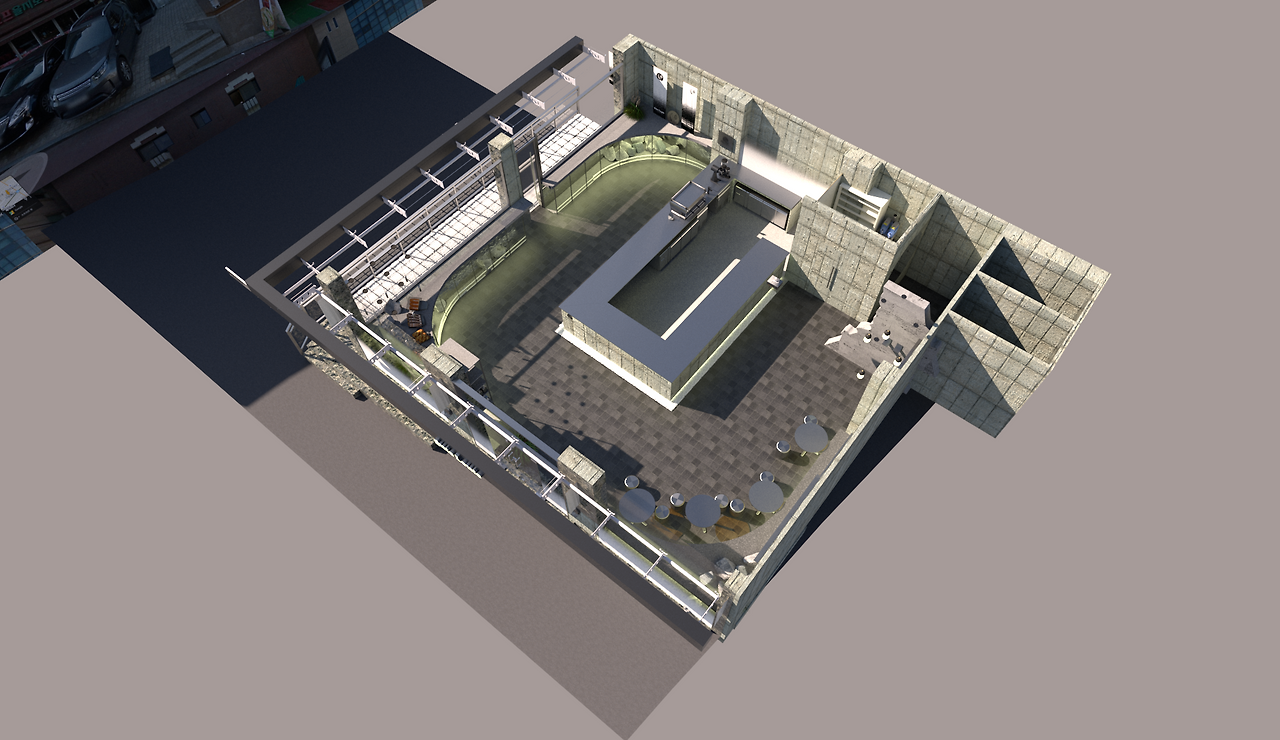 일반적인 좌석이 빽빽한 보통의 카페 인테리어들의 레이아웃을 홀 가운데 큰 바를 중심으로 테두리에 둘러 서거나 바의자로 앉는 형태로 기획하여, 공간에 답답함 없이 시원하게 열린 공간에 빛으로(바리솔)로 포인트를 주는 방법을 생각했습니다.