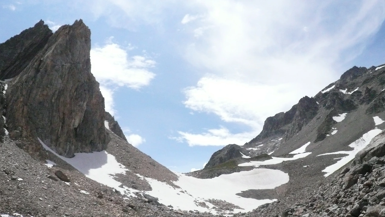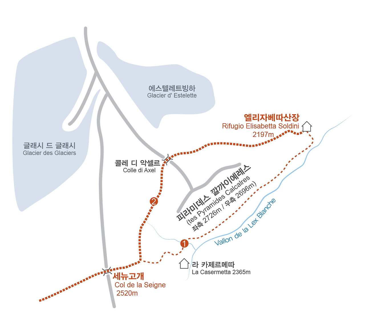 ② 세뉴고개 왼쪽으로 쌍둥이처럼 서있는 피라미데스 깔까이예레스(tes Pramides Calcalres,좌측 2726m/우측 2696m) 고개를 넘어 에스텔레트 빙하(Glacier de Estelette) 쪽으로 가는 코스다.